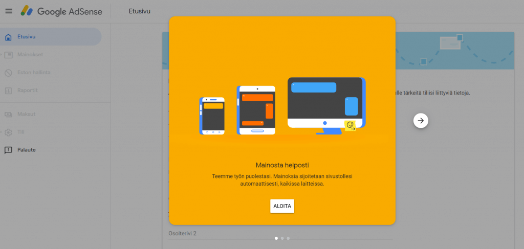 Jos/kun sinulta kysytään mainostyypeistä, niin salli automaattinen. Silloin Google esittää omasta mielestään sopivimmat mainosmallit sivuilla. Toimii itseasiassa kohtuullisen hyvin.