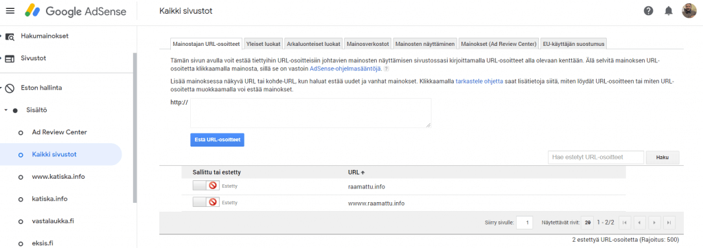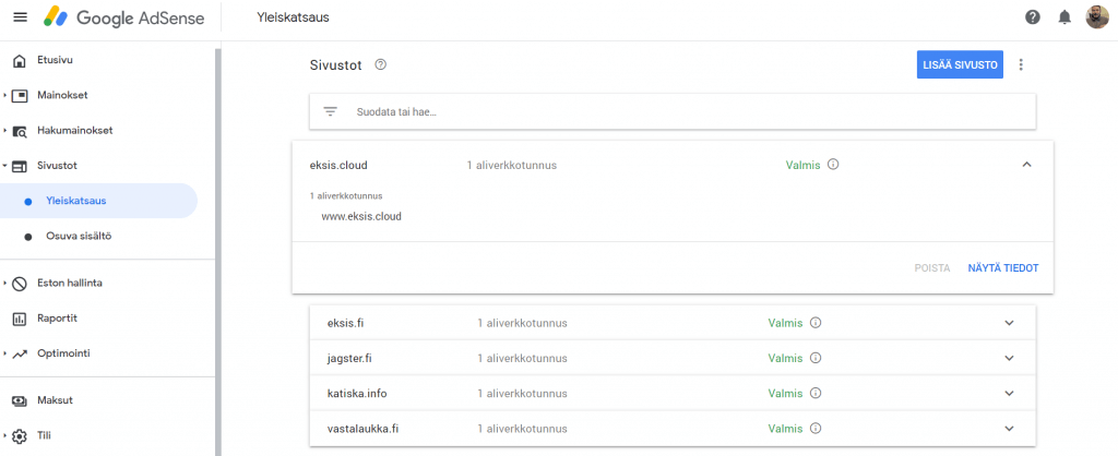 Jos esität mainoksia useammalla sivustolla, niin Sivustot > Yleiskatsaus on, missä määrittelet missä mainoksia voidaan esittää.
