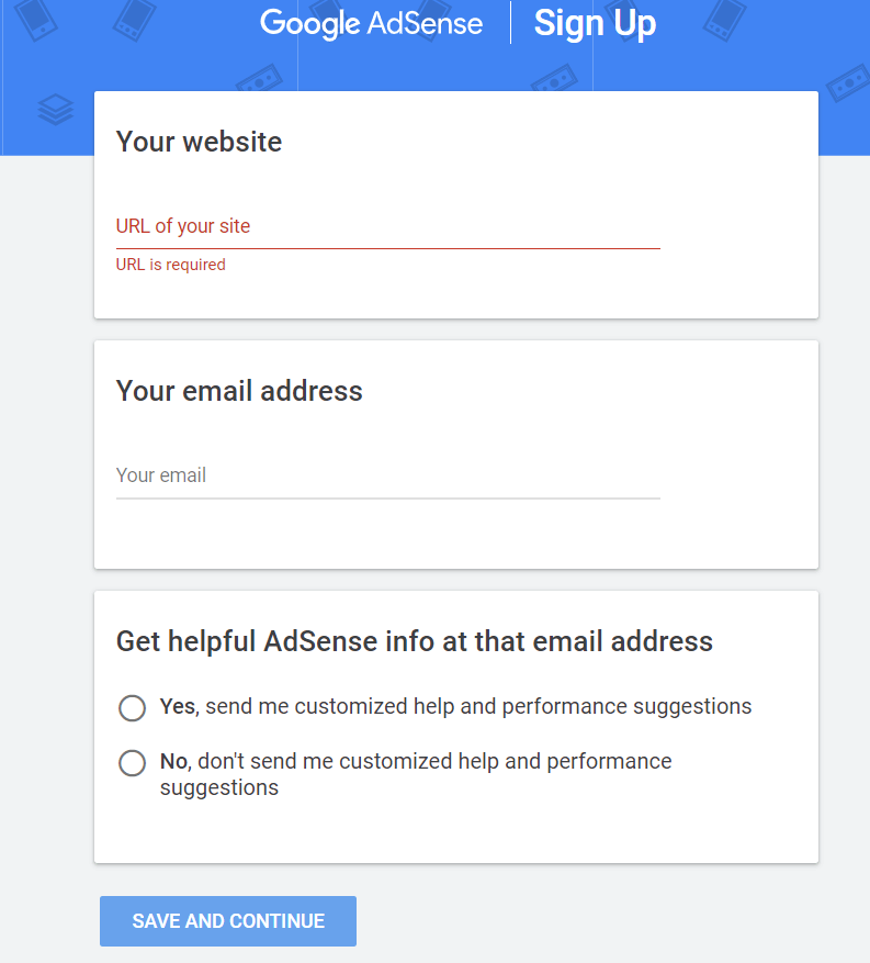 Mene osoitteeseen Google Adsense. Kirjaudu sisään Google-tunnuksellasi (gmail-tunnus) tai jos olet jo selaimella kirjautunut, niin homma hoituu kysymyksellä haluatko käyttää olevaa osoitetta. Sinulle ilmoitetaan, että tiliä ei ole kytketty Adsense-tiliin ja pyydetään valitsemaan sign up. Tuo kaikki riippuu hieman siitä millä laitteella olet liikkeellä ja mitä palveluja sinulla on Googleen kytketty, mutta loppujen lopuksi päädyt ikkunaan, jossa pyydetään sivuston tietoja.