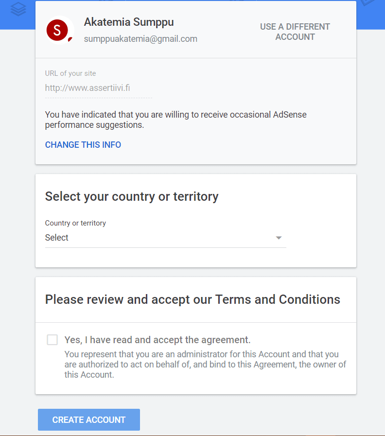 Tarkista tiedot ja valitse maaksi Finland. Hyväksy ehdot (fiksu lukisi ne ensin, mutta ei sitä kukaan tee ja ilman ehtojen hyväksymistä tiliä et saa; ei se ole neuvottelukysymys). CREATE ACCOUNT luo sinulle Adsense-tilin.