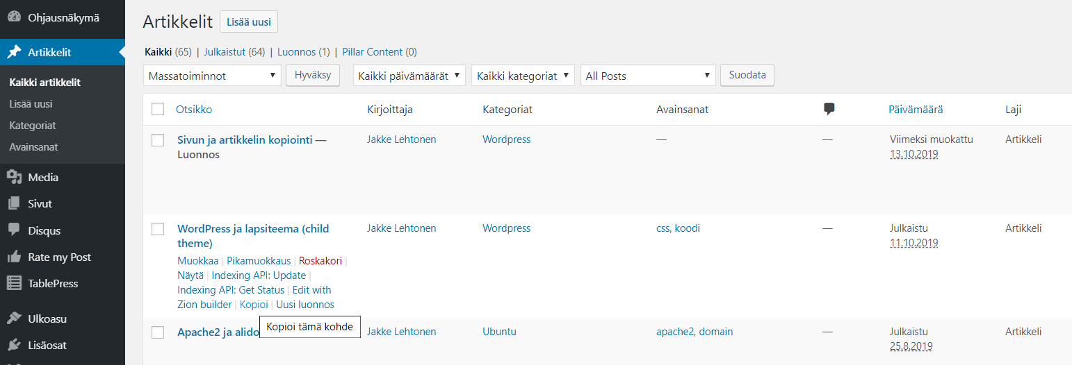 Nyt sinulla on artikkelin, sivun ja muiden sallimiesi sisältötyyppien listauksessa uusi pikavalikkokohta: kopioi (tai clone, jos käytät englanniksi).