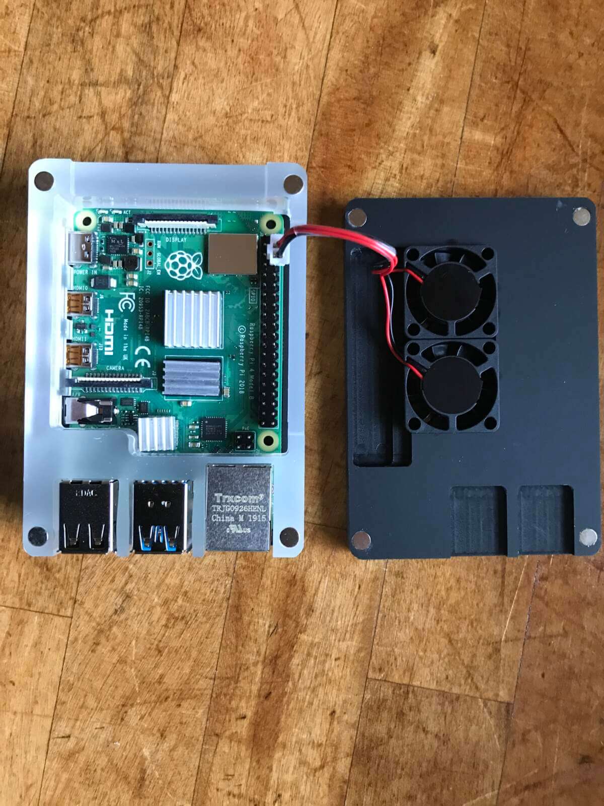 Jätin ostamatta peruskotelon, koska kahdella tuulettimella oleva maksoi lähes saman. Lämpö on aina pahaksi ja vaikka flektit olivatkin aika leluja, niin ne ovat parempia kuin olla ilman. Koteloita löytyy maailmalta erilaisia eikä niissä ymmärtääkseni muutoin ole mitään muuta eroa kuin ulkonäkö. Itse en piittaa siitäkään, koska haluan Raspin olevan piilossa. Näppärä 3D-tulostimen omistaja tehnee itse omansa.