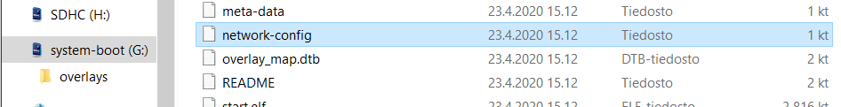 Avaa tiedostonhallinnassa boot-osio, ei ns. varsinainen muistikortti. Avaa tiedosto network-config muokattavaksi.
