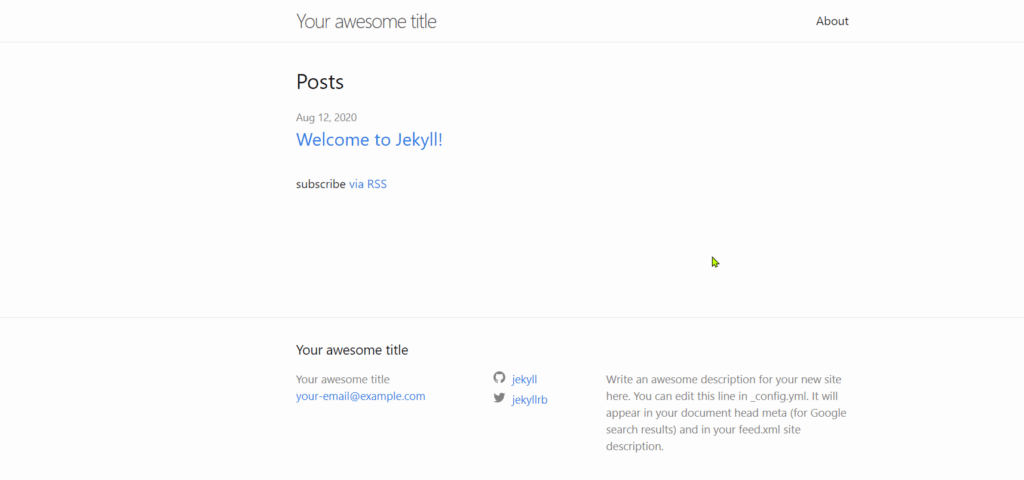 Jekyllin käyttö vaatii enemmän työtä ja sille on omat juttunsa. Mutta on silti hyvä kokeilla, että asennus toimii. Joten tehdään ensimmäinen testisivusto ja katsotaan miltä se näyttää.