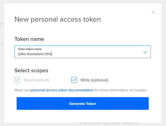 - Anna API:lle joku nimi, mistä tunnistat itse sen myöhemmin. Klikkaa Generate Token.