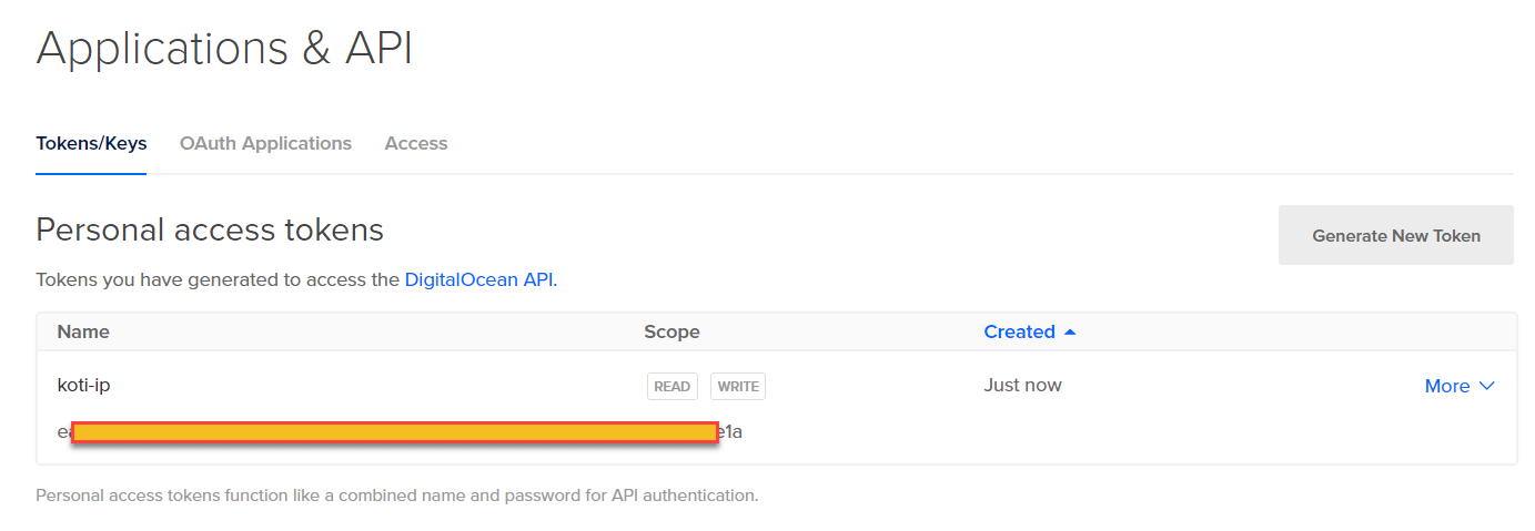 IP-osoitteen dynaamiseen A-tietueen muuttamiseen tarvitaan DigitalOceanin API. Joten kirjaudu tilillesi ja klikkaa Account > API.