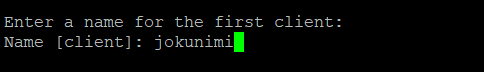 Ensimmäiselle asiakkaalle/käyttäjälle (client) täytyy keksiä nimi. Se voi olla mitä vaan, kunhan se on yksi sana ilman erikoismerkkejä. Keksi jotain. Aidosti kyse on asetustiedoston nimestä, jota tarvitaan asiakaslaitteessa – kuten vaikka kotiläppärillä – yhteyden tekemiseen. Joten vaikka se voi olla aidosti ihmiskäyttäjäkohtainen, niin se on silti vain yksi asetuskokonaisuus. Pärjäät samalla niin läppärin kuin tabletinkin kanssa, joten et joudu tekemään edes laitekohtaisia.