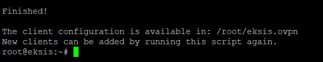 Kun asennus on valmis, niin toiseksi viimeinen rivi kiinnostaa sinua. Siinä on tiedosto, jota käytetään omassa koneessasi VPN-yhteyden muodostamiseen. Se löytyy aina käyttäjäsi kotihakemistosta (joka minulla siis on /root, mutta sinulla ehkä mallin /home/tunnus ja pääset sinne myös komennolla cd ~/ ) ja on .ovpn päätteinen.