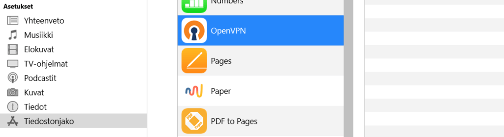 Voit lähettää sen mailin liitteenä ja avata OpenVPN appilla. Tai sitten kytket laitteesi tietokoneesi iTunesiin ja valitset asetukset puolelta tiedostonsiirron, listasta OpenVPN ja raahaat .ovpn tiedoston ikkunaan.