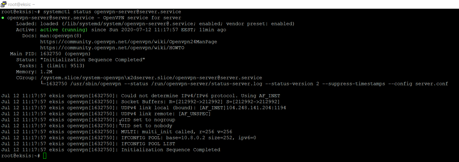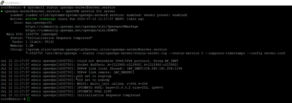 OpenVPN on nyt saatavilla, mutta ei käynnissä. Se hoituu tutulla systemctl komennolla, kunhan muistaa, että palvelun nimi on openvpn@server tai pidemmässä muodossa openvpn@server.service. Joten sallitaan se ja samalla varmistetaan, että VPN herää myös rebootissa: