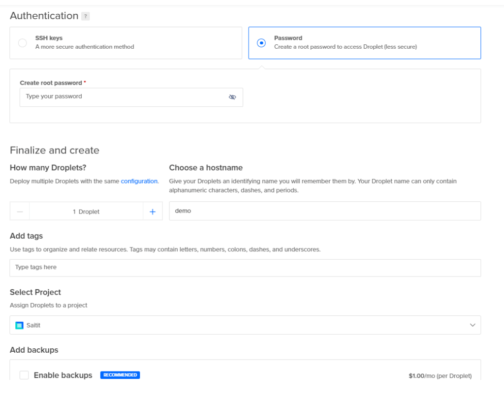 - Authentication: Password (luot root-tunnuksen salasanan kohdassa Create root password)