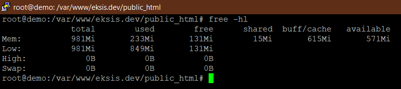Katso paljonko sinulla on sarakkeessa free, minulla oli 131 MB. Pyöristän sen alaspäin 100 megaan, koska tarvitaan hieman pelivaraa, ja laitan muistiin. Mutta muutoin… serveri on vasta asetettu, ja aika paljon hyödyllisiä ohjelmia vielä puuttuu – eikä muistia ole vapaana kuin 130 megaa, ilman kävijöitä. Tämä on se syy miksi DigitalOceanin 5 taalaa kuussa maksava droplet on vain kokeilua varten.