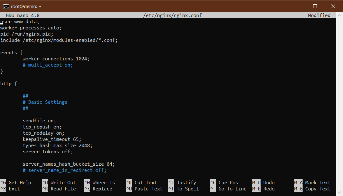 Tehdään uusi nginx.conf aloittamalla sellaisen kirjoittaminen Nanolla:
