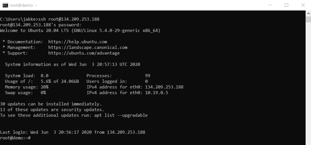 - Sinulta ei kysytä käyttäjätunnusta, koska kerroit SSH-komennossa, että se on root
