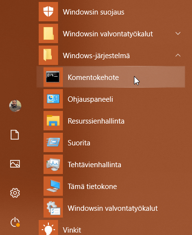 Sinun ei kuitenkaan tarvitse heti alkaa riitelemään PuTTYn kanssa, vaan alkuun pääsee Windowsin omalla komentokehoitteella. Löydät sen käynnistysvalikosta Windows-järjestelmä takaa. Jos törmäät sellaiseen kuin PowerShell, niin sekin kelpaa mainiosti.