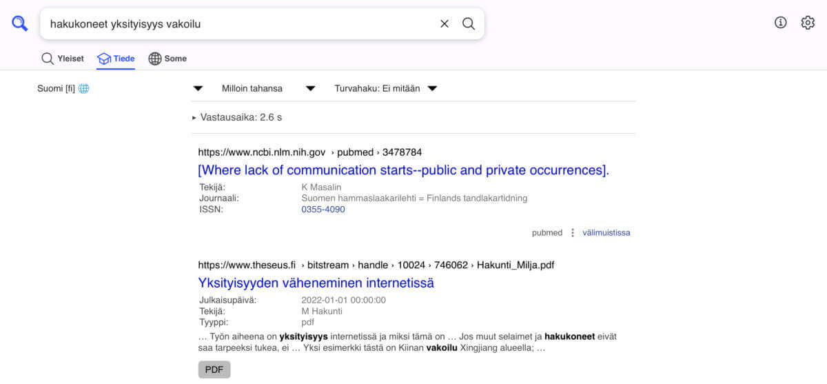 Pidän hieman akateemisempia hakuja esimerkkinä, koska itselleni niiden löytäminen perinteisten hakukoneiden kautta on vaikeaa. Mutta voisinhan minä tehdä samanlaisia rajauksia esimerkiksi kuvien tai meemien suhteen. Tai musiikille ja podcasteille.