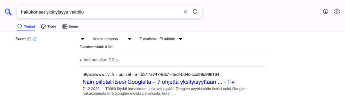 Toki voisi käyttää myös Bravea tai jotain muuta hakumoottoria, joka oman ilmoituksensa mukaan ei seuraa käyttäjiä. Mutta silloin olisin riippuvainen siitä mitä Brave on indeksoinut ja miten se esittää tulokset. Brave ei ole kovinkaan hyvä hakukone, ja aivan riippumatta mitä mieltä olen seurannasta, jonka ainoa tarkoitus on kohdentaa mainoksia, niin haluan hakutuloksia. Ja siinä Brave, ja muutkin marginaalissa olevat hakusivustot, kompastuvat.