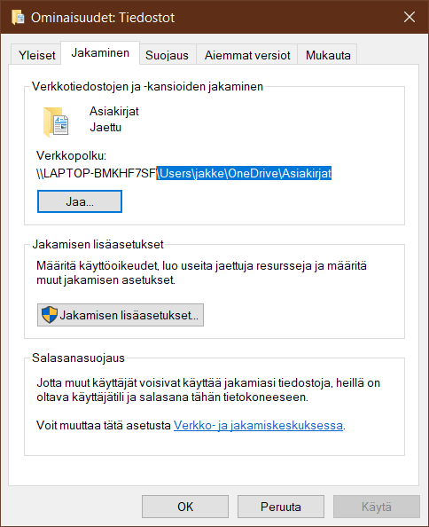 - Jos ylhäällä kansion jakamisen alla lukee Jaettu, niin kaikki on hyvin ja voit poistua. Jos ei ole, niin klikkaa Jaa…, valitse oma tunnuksesi ja klikkaa painonappulaa Jaa.